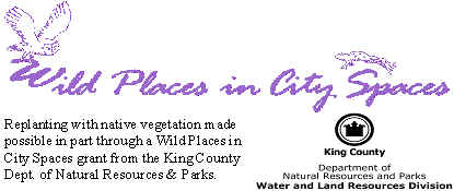 When the money becomes available, we will be doing the next phase of replanting slopes in sections of 20-50 feet of stream length at a time, placing the plants more closely together where the slopes are steepest and erosion most evident. We plan to order the shrubs from King County Conservation District this November, get them in March, and do the planting with volunteers from Ravenna Woods Condos. We hope that the diverse mix of riparian vegetation will make banks relatively stable and at the same time attract more bird species.